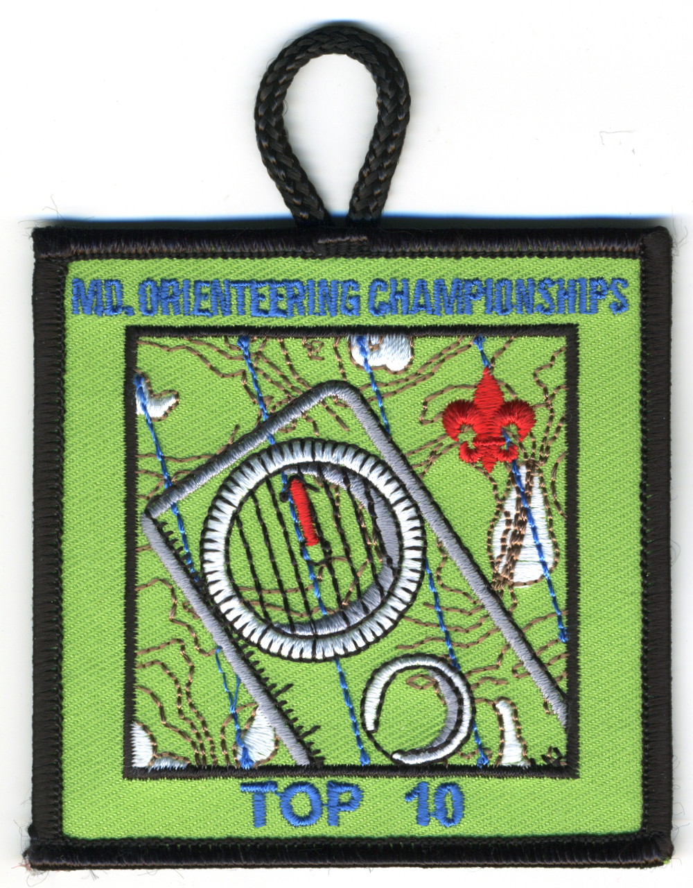 | Top 10 | LGr | Blk | R | Blu | square | Red | Compass on topo map; “MD Orienteering Championships”; “Top 20”; button loop | |